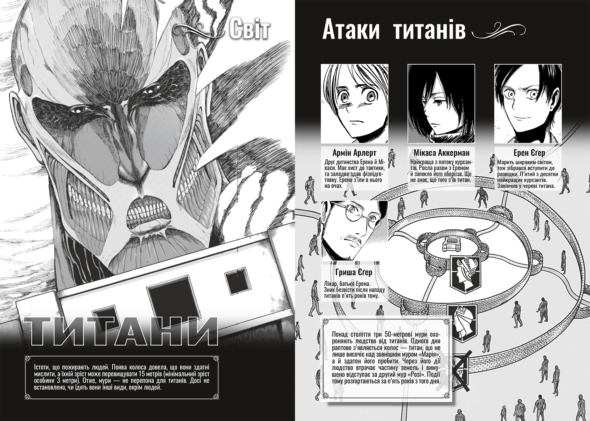 «Атака титанів» — темна фентезі-манґа, створена Хаджіме Ісаямою. Сюжет розгортається в постапокаліптичному світі, де залишки людства ховаються за трьома величезними стінами, щоб захиститися від жахливих істот — титанів. Історія розповідає про молодого хлопця Ерена та його друзів Мікасу та Арміна. Спокійне життя трійці руйнується, коли один із титанів прориває зовнішню стіну, дозволяючи монстрам увірватися у місто. Герої вступають до військового корпусу, щоб боротися з титанами, розкривають приголомшливі таємниці їхнього походження та дізнаються про природу світу, в якому вони живуть.
