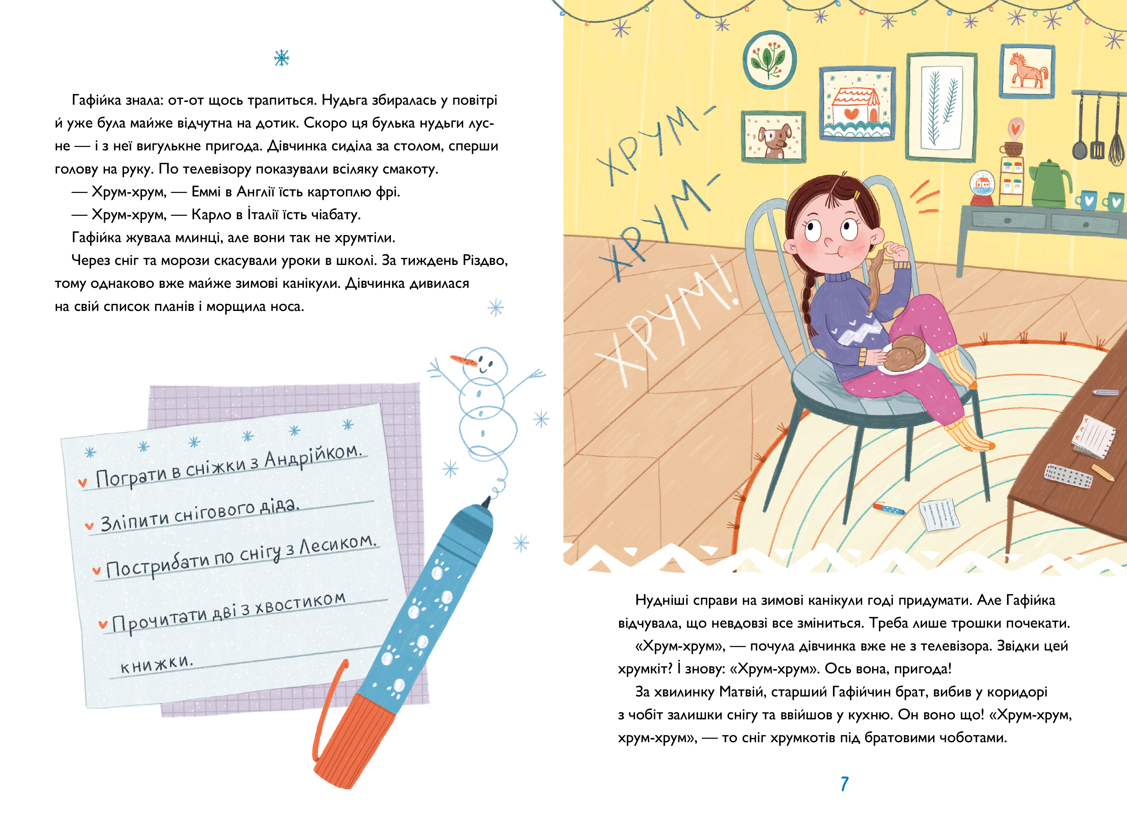 Хрум-хрум, хрум-хрум… Цей загадковий звук запрошує Гафійку до несподіваного детективного розслідування. Разом із другом дівчинка намагається з’ясувати, що приховує її брат Матвій у дворі. Знайдені підказки ще більше заплутують, але Гафійка вперто шукає відповіді. Чи вдасться їй розгадати велику таємницю до Різдва?
