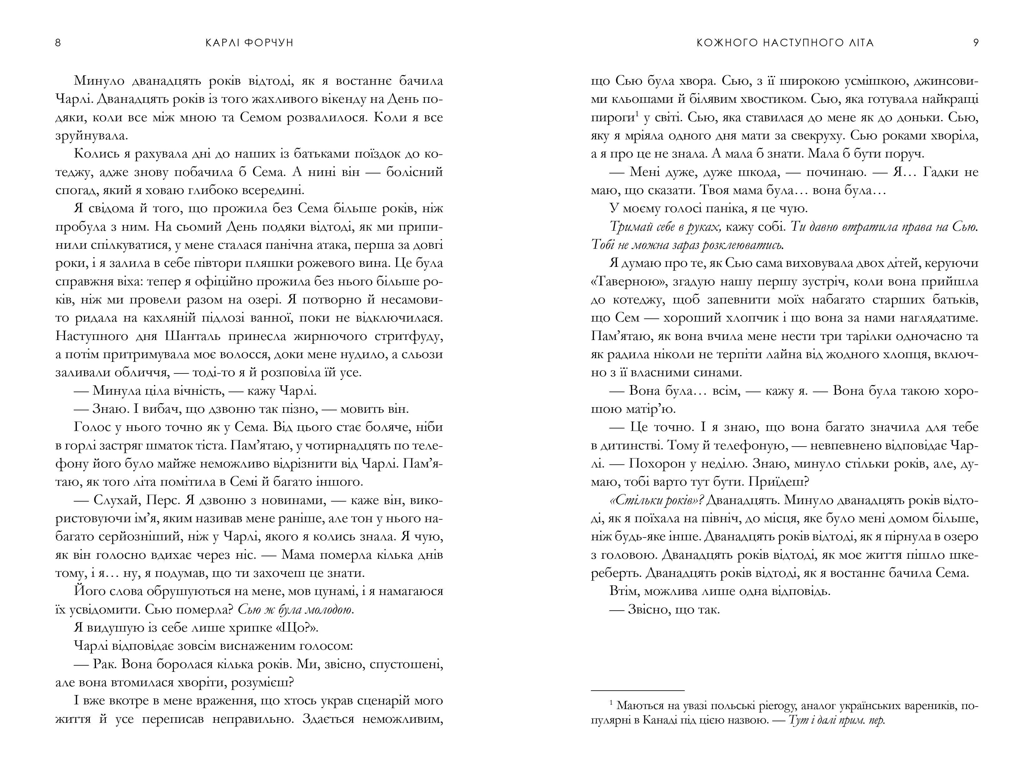 Замість того щоб проводити щасливі літні дні на березі озера свого дитинства, вона оселилася в стильній квартирі в місті й тримає людей на відстані. Аж поки один телефонний дзвінок не змушує її стрімголов повернутися додому — і до Сема Флорека, чоловіка, без якого вона колись не уявляла життя.