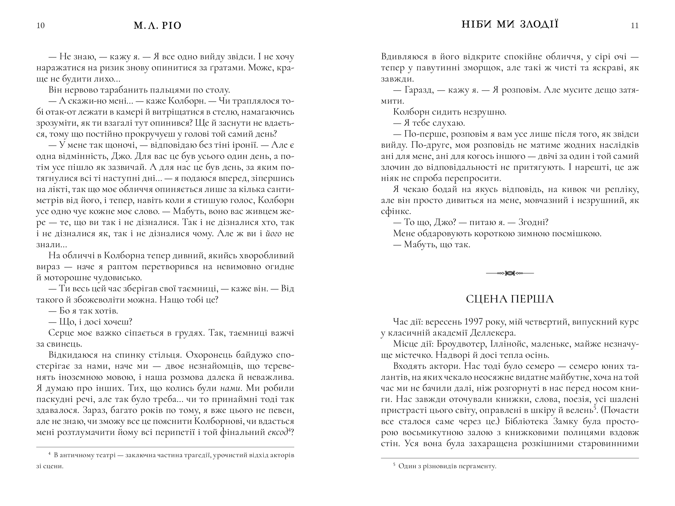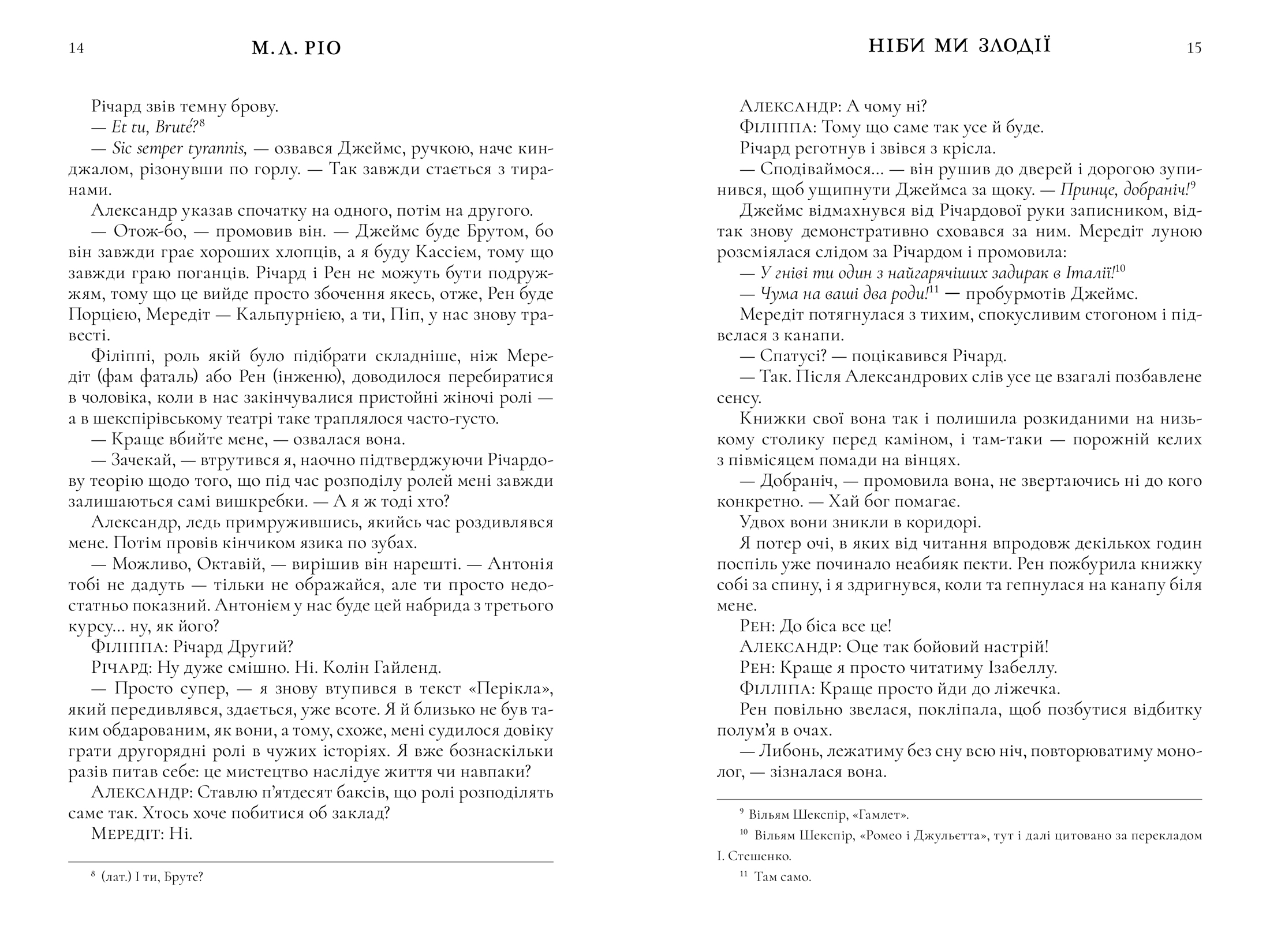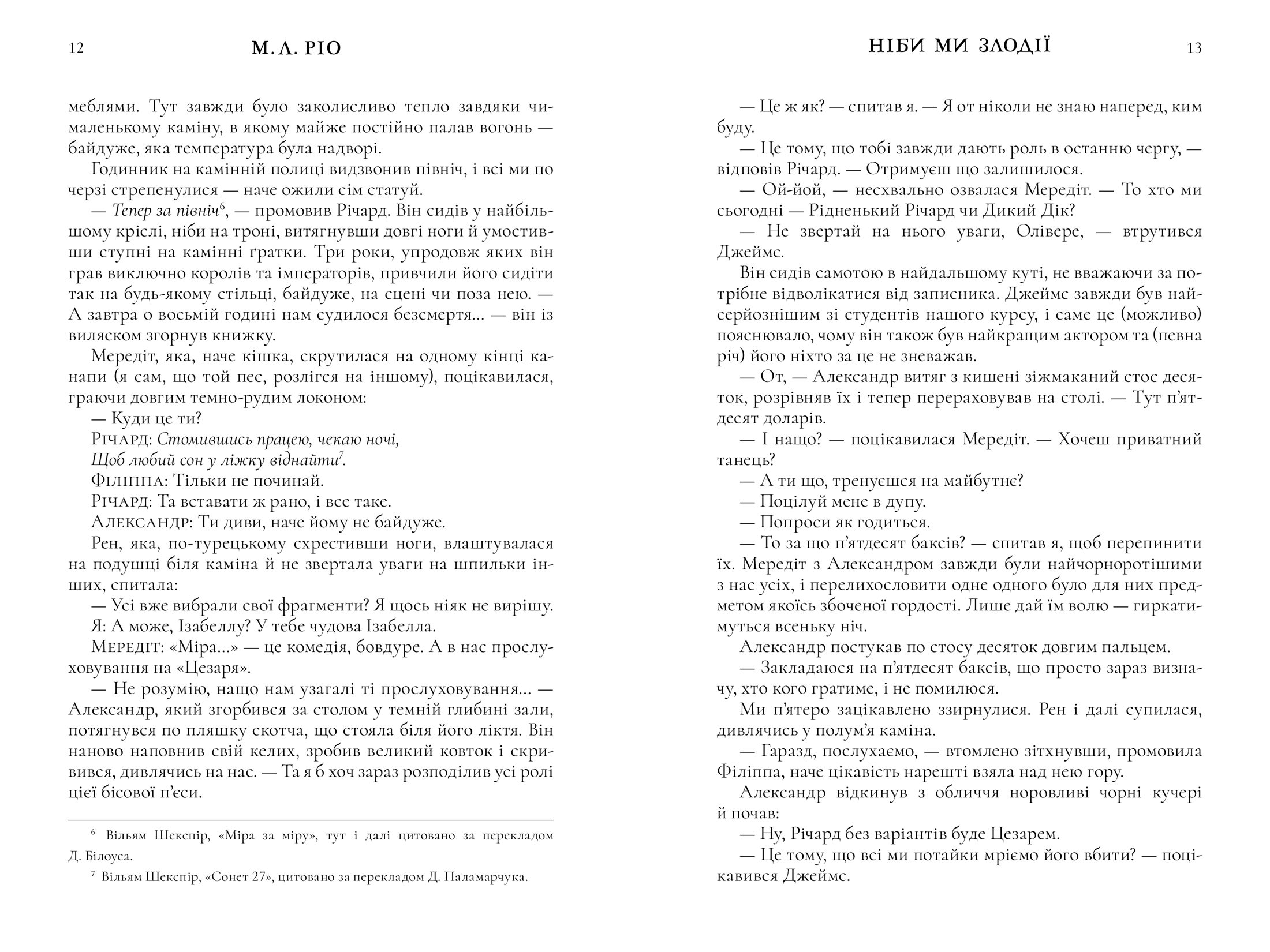 Найкраще, що є на цих сторінках — це атмосфера. Відчуття, ніби ти свідок подій, які хочеш забути. Це твої однокурсники, друзі, вороги чи навіть конкуренти? Ти знаєш їхні вподобання та секрети, а творчість Шекспіра цитуєш напам’ять. Король трагедій поділився своїм досвідом, а М.Л. Ріо розкриває інший бік жертовності.