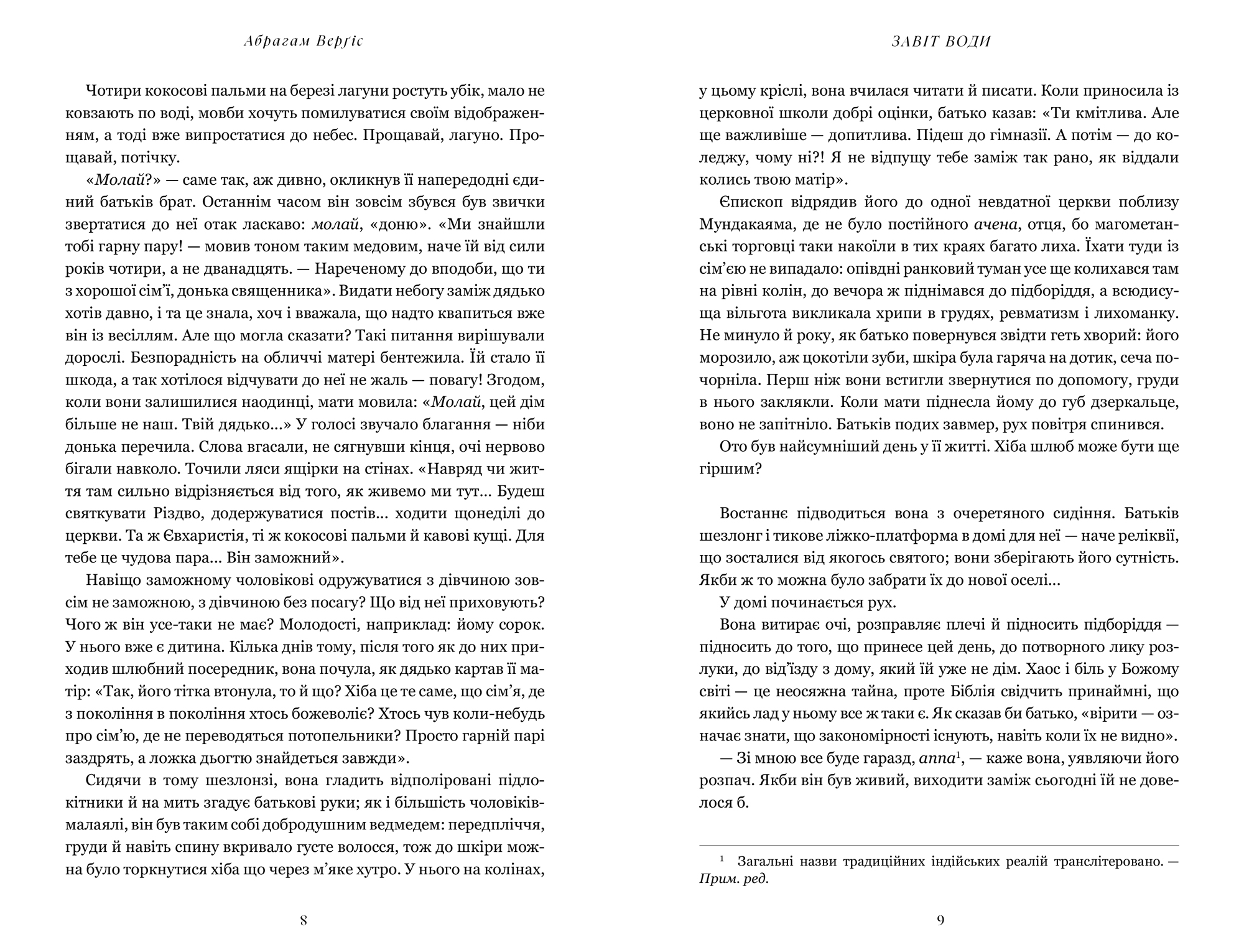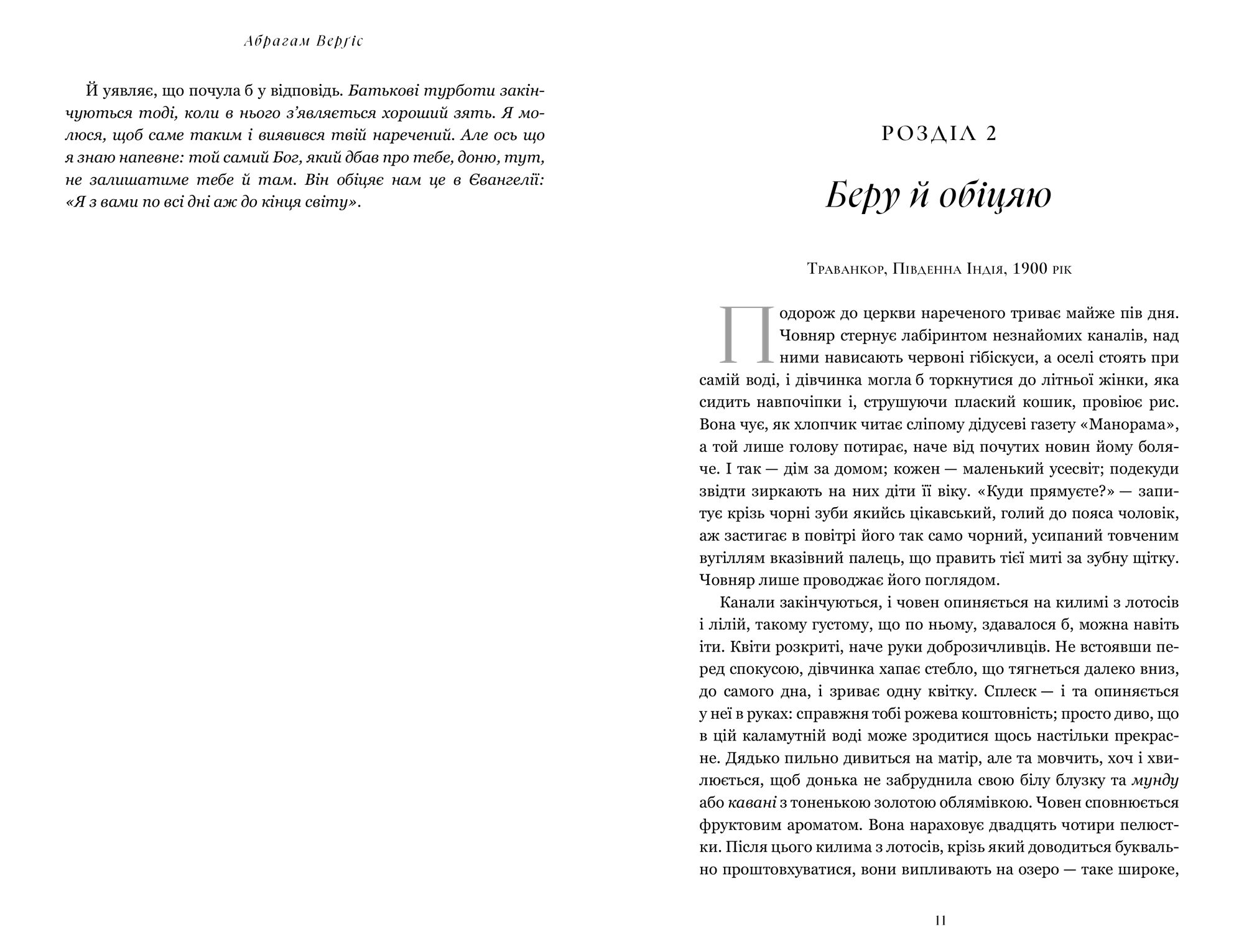 - Роман Абрагама Верґіса — це не просто сімейна сага в екзотичних декораціях. Це мудра і добра розповідь про те, що сім’ю створює не кровна спорідненість, а спільність долі; що вибір є завжди, але не завжди є сили його здійснити; що всі ми навіки пов’язані одне з одним своїми діями і бездіяльністю і що ніхто не залишається на самоті.